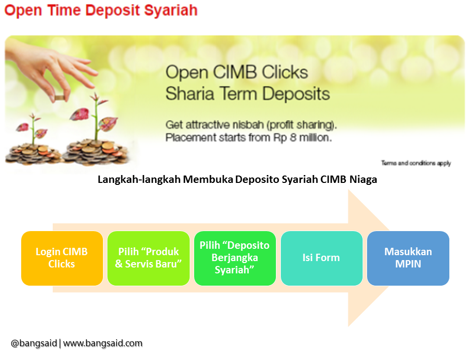 Mudah sekali bukan? Hanya dengan login ke fasilitas cimbclicks kemudian memilih produk dan layanan baru, yakni Deposito Berjangka Syariah kemudia mengisi form yang telah disediakan, serta memasukkan MPIN (Pin digital yang dikirimkan melalui SMS ke nomor handphone yang sudah didaftarkan sebelumnya) dana di rekening tabungan kita sebelumnya langsung secara otomatis dipindahkan ke rekening deposito. Hanya dengan langkah mudah di atas dan dana setoran mulai dari Rp 8 juta, kita sudah memiliki rekening deposito di CIMB Niaga.
